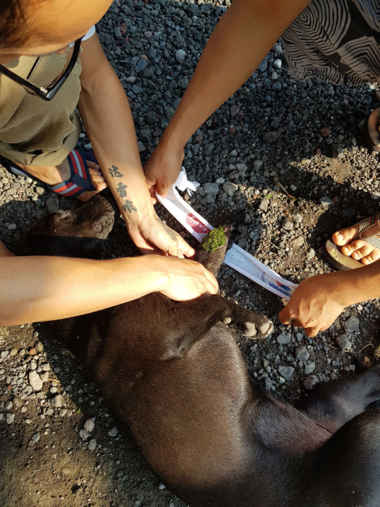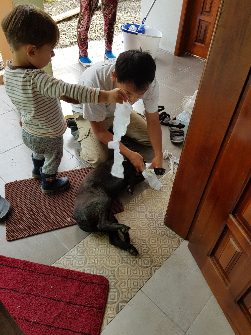Gleich zu Beginn der Quarantäne wurde unsere jüngste Hündin Chiquita von einem Auto angefahren. Da wir kein Auto zur Verfügung hatten und wir durch die Ausgangssperre nicht zum Tierarzt konnten, haben meine beiden Männer tatkräftig Hand angelegt. Ich staune immer und immer wieder über das breite Wissen von Leo. Die guten Gedanken unserer Freunde und das Kräuterwissen meines Mannes haben geholfen, dass unsere » kleine» nun fast vollständig genesen ist.
