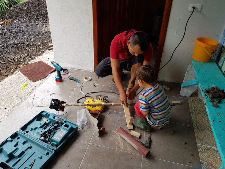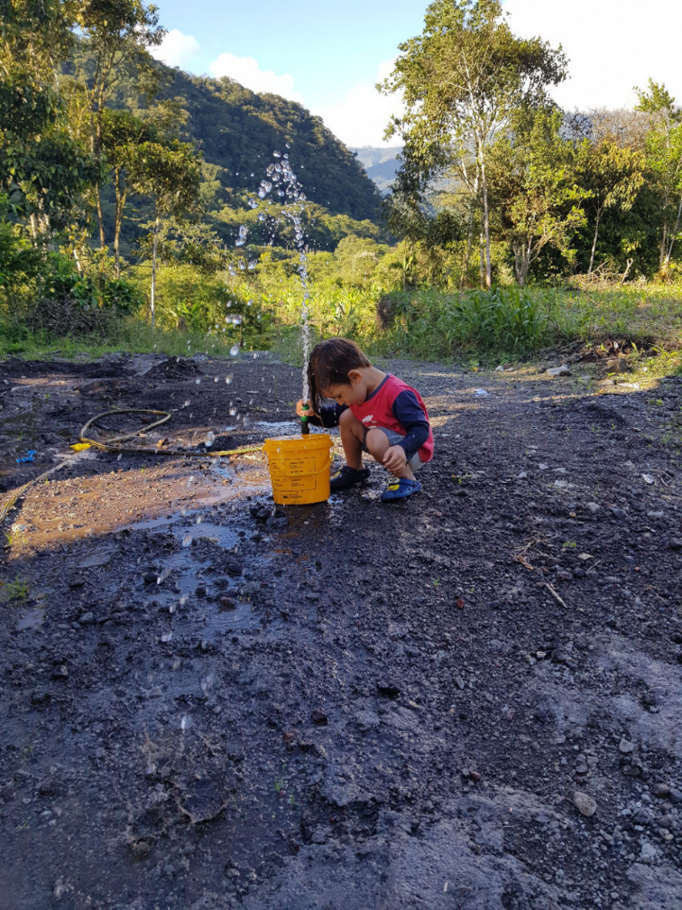 Leo ist jetzt auch unter die Spielzeugbauer gegangen. Da wir ja nur wenige Spielsachen für Inti haben und wir nur Lebensmittel einkaufen können, hat er kurzerhand aus den Resten Neues kreiert. Der neue Bagger von Inti muss überall hin mitkommen und ist der neuste Stolz unseres kleinen, grossen Jungen. Aber das absolute Highlight ist natürlich der elektrische Fadenmäher. Ein Mäher bei dieser wilden Natur ist hier unverzichtbar. Inti hat, dank dem er nicht viele Spielsachen hat, immer fiktiv herumgemäht. Jetzt hat er einen «echten» und mäht das fiktive Gras in unserem Wohnzimmer täglich ab. Er nimmt seine Aufgabe sehr ernst. Auch baut Inti aus Kissen und Decken seine Küche mit der er uns köstliche Spiegeleier brutzelt, schnelle Autos baut, mit Booten um die Weltmeere (oder nach Baños) fährt, Kranen und wilde Pferde etc. werden auch daraus kreiert. Der Rücken des Papi dient als Rutschbahn und seine Phantasie kennt keine Grenzen. Es ist inspirierend und bereichernd  ihm zu zuschauen.