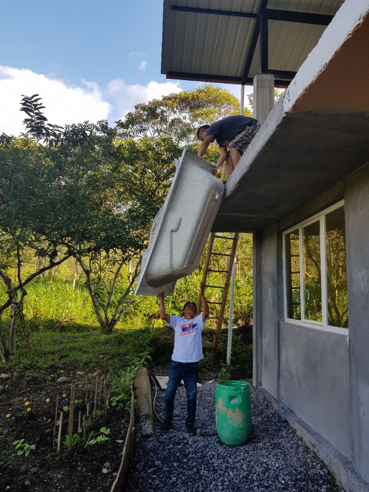 An Visionen und Ideen mangelt es dem «Häuptling» Leo nicht. Ich spüre, dass er immer mehr zurück in seine Kraft kommt und vermehrt sein «altes» Wissen wieder abrufen kann. So nahm er die im zweiten Stock noch nicht installierte Badewanne nach unten und bastelte ein provisorisches Gestell, damit ich nun jeden 2-3. Tag ein heisses Ingwerbad geniessen darf. Der weisse Ingwer oder die sogenannte Schmetterlingslilie und auf lateinisch  Hedychium coronarium genannt, wächst bei uns wie Unkraut in unserem Wald. Dieser Ingwer ist entzündungshemmend und auch seine Blüte kann verzehrt werden (bei uns ist alles Bio und Pestizide sind auf unserem Land strengstens verboten). Das heisse Bad mit dem Ingwer ist unglaublich wohltuend und meine Schmerzen bei den Hüften sind nun praktisch weg. Auch hat meine Hebamme mir einen Heilkräutertee verschrieben, den ich täglich trinken soll. Ruckzuck hat Leo all diese Blätter und Kräuter in unserer Umgebung gefunden und der Tee schmeckt wirklich sehr gut.