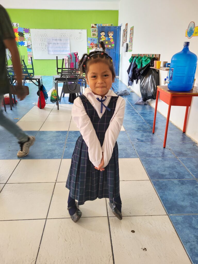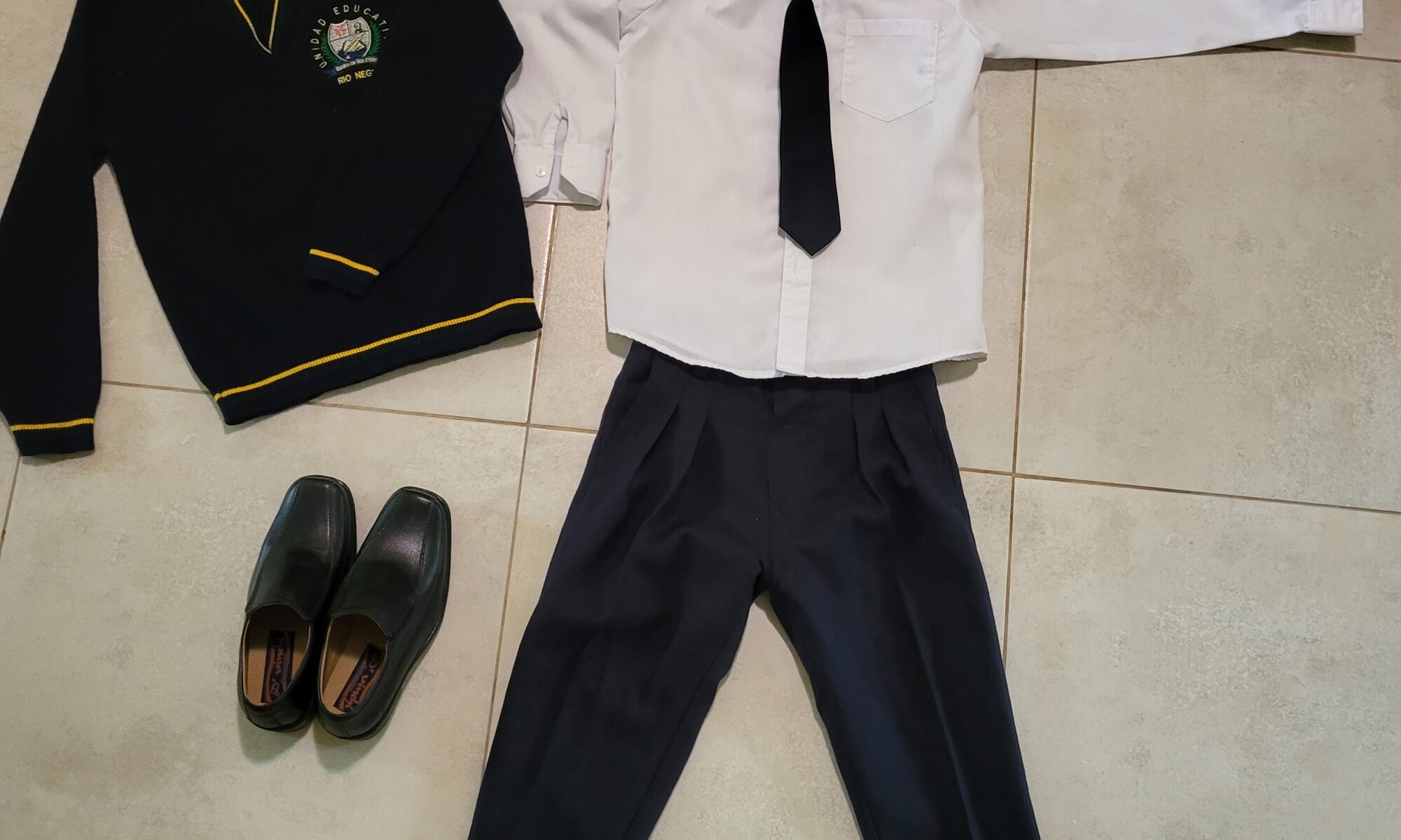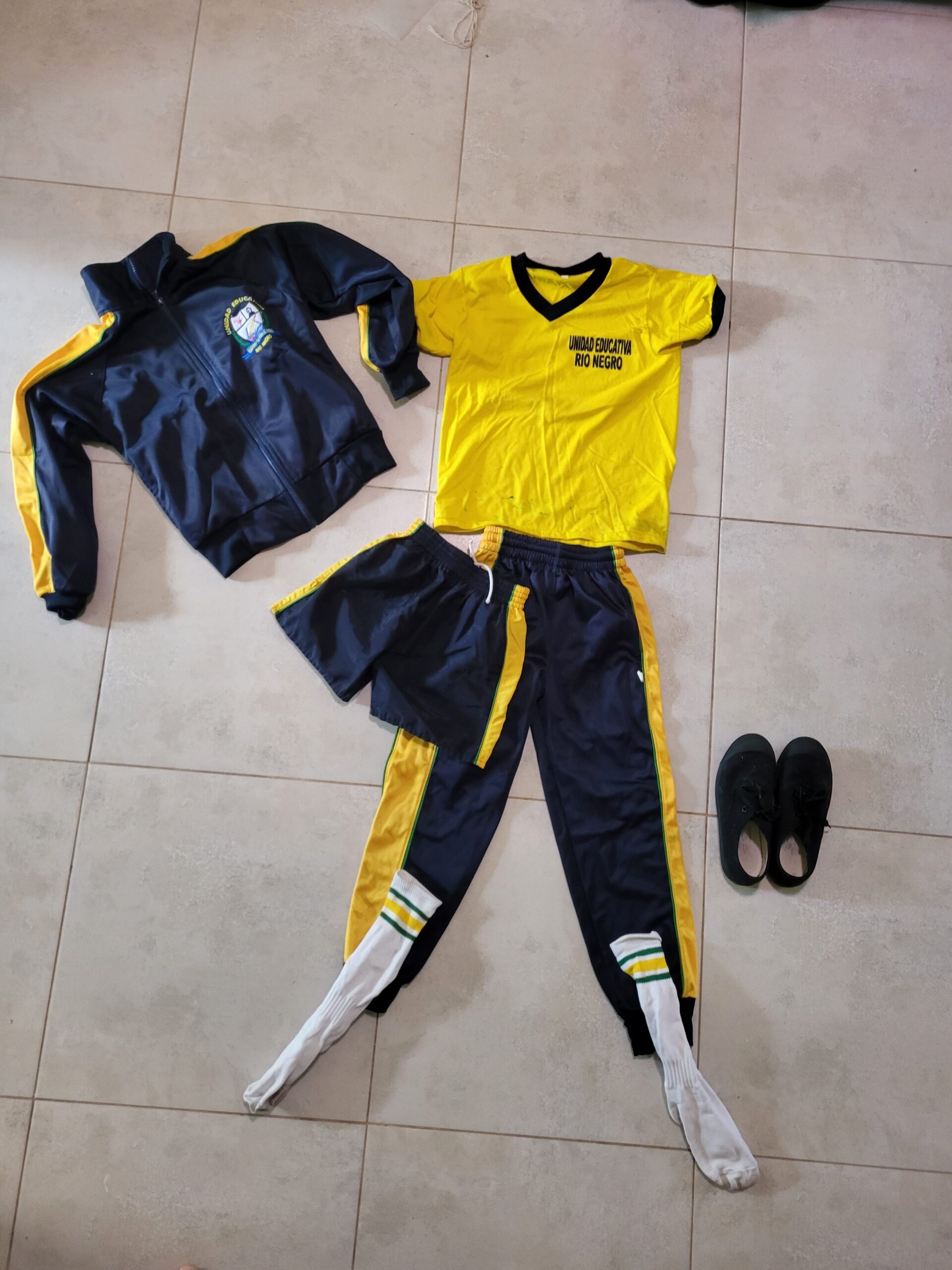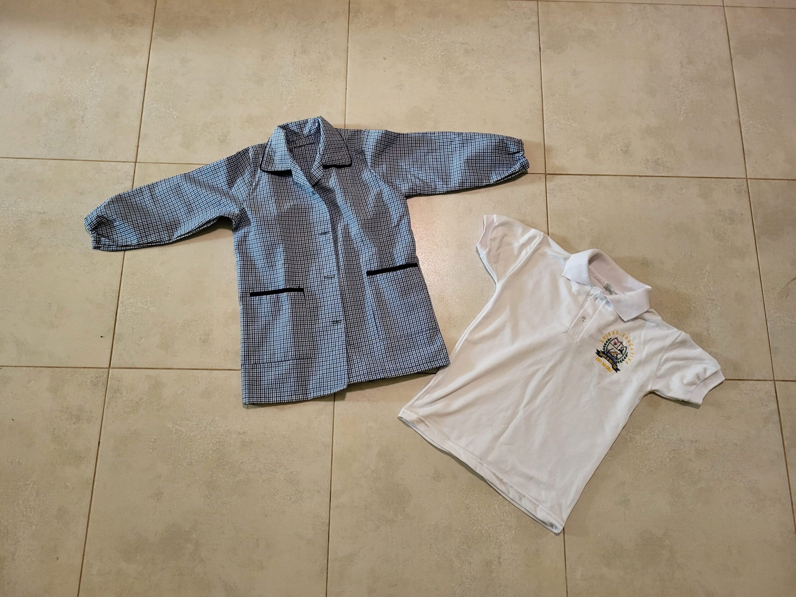 Am Montag sind die schönen Kleider mit Krawatte Pflicht. Dazu gehören auch schöne Schuhe. Am Dienstag werden die gelben Sportkleider mit schwarzen Sportschuhen getragen, am Mittwoch das Poloshirt mit den schönen Hosen, am Donnerstag Plomo, also graue Sportkleider (davon habe ich leider kein Foto) und am Freitag wieder die gelben Sportkleider. Zum Malen und Basteln tragen sie eine Schürze, die auch dazu gekauft werden musste.