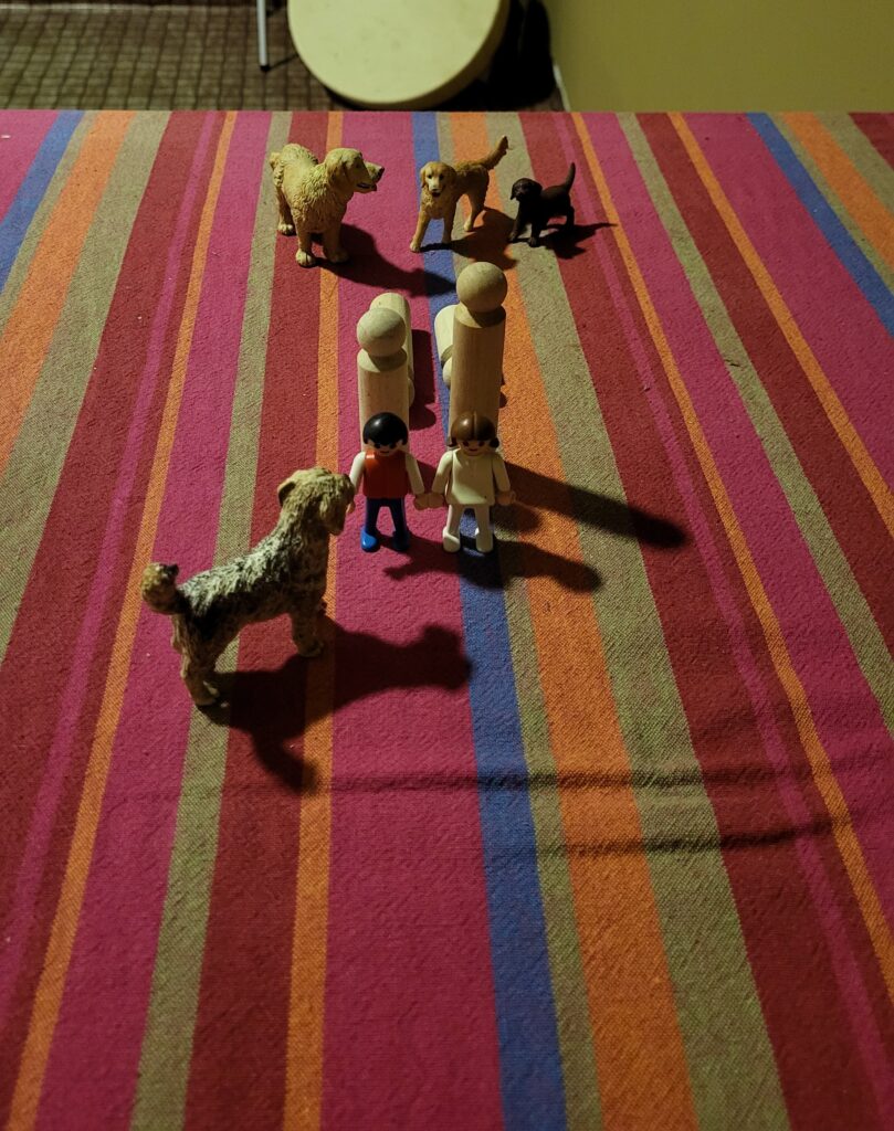 Wie auf dem Bild gezeigt, «Spiele» ich mit Playmobil und Schleichtieren eine gewisse Situation nach und kann diese auch nach «Gespür» verändern. So können bestimmte Situationen besser verstanden oder aufgelöst werden.